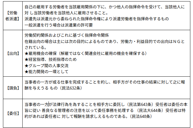 これらの関係を正確に理解しておき、実態(※)に合った適正な契約・管理を行なわないと法律違反になりかねませんのでご注意ください
